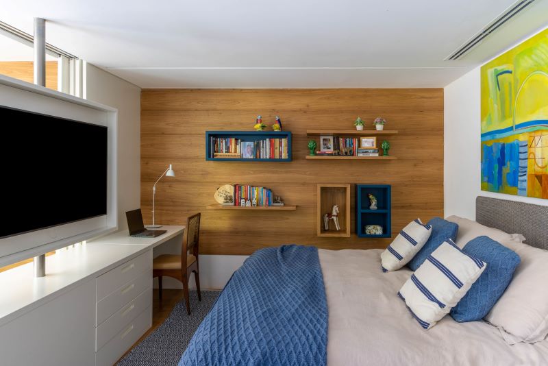 Já no segundo andar da residência, as transformações foram ainda maiores. Como era preciso criar mais suítes, a solução foi tirar um closet existente eliminando toda a área de circulação e reconfigurando completamente os espaços. Assim, cada um dos cinco filhos ganhou seu próprio quarto com banheiro além de uma sala de uso comum. E o casal ainda pôde manter sua suíte master com área de trabalho, uma sala íntima e um pequeno terraço individual.