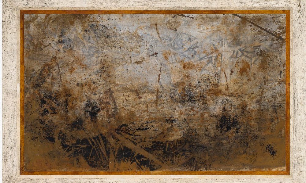 Daniel Senise conta que o trabalho “Sem título 1” (2024) – monotipia de parede em tecido, médium acrílico, carvão e pó de ferro sobre placa de alumínio, com dois metros de altura por1,5 metro de comprimento – “liga o que eu estou fazendo nesses últimas duas décadas” com a produção atual. “Essa pinturinha é uma parede, uma casa, e veio na captura”, descreve. “Aqui são vários procedimentos, que eu vou misturando”. “Acho que tudo começou com ela”. “Estou usando muita captura de parede agora”.