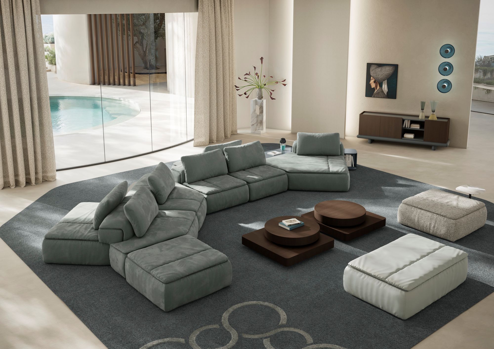 A instalação também serve como cenário para o lançamento da nova coleção Natuzzi Italia – Rooted in Harmony, apresentada pela primeira vez em Miami. Entre os destaques está Amama, um projeto modular de ilha assinado por Andrea Steidl, que explora a convivialidade por meio de uma estrutura multifuncional de dupla face. Com diferentes texturas, materiais e geometrias, Amama permite infinitas composições e inaugura uma nova abordagem para o viver contemporâneo, expandindo-se para elementos de sala de estar e jantar.