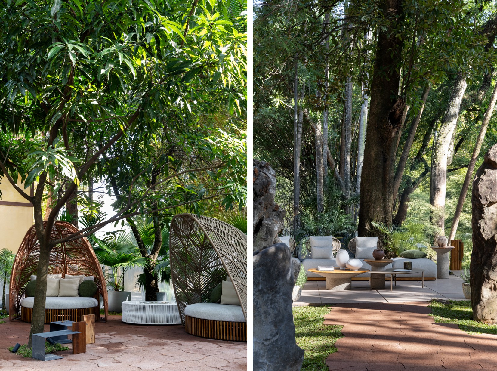 Entre os exemplos, estão os móveis assinados por Ibanez Razzera, como os Balanços Samambaia (com estofados orgânicos, estrutura em alumínio e trançados em corda náutica) e as Chaises Oca (cobertura de alumínio trançada em corda náutica chata, chaise de alumínio com madeira teca, além de almofadas e encostos removíveis).