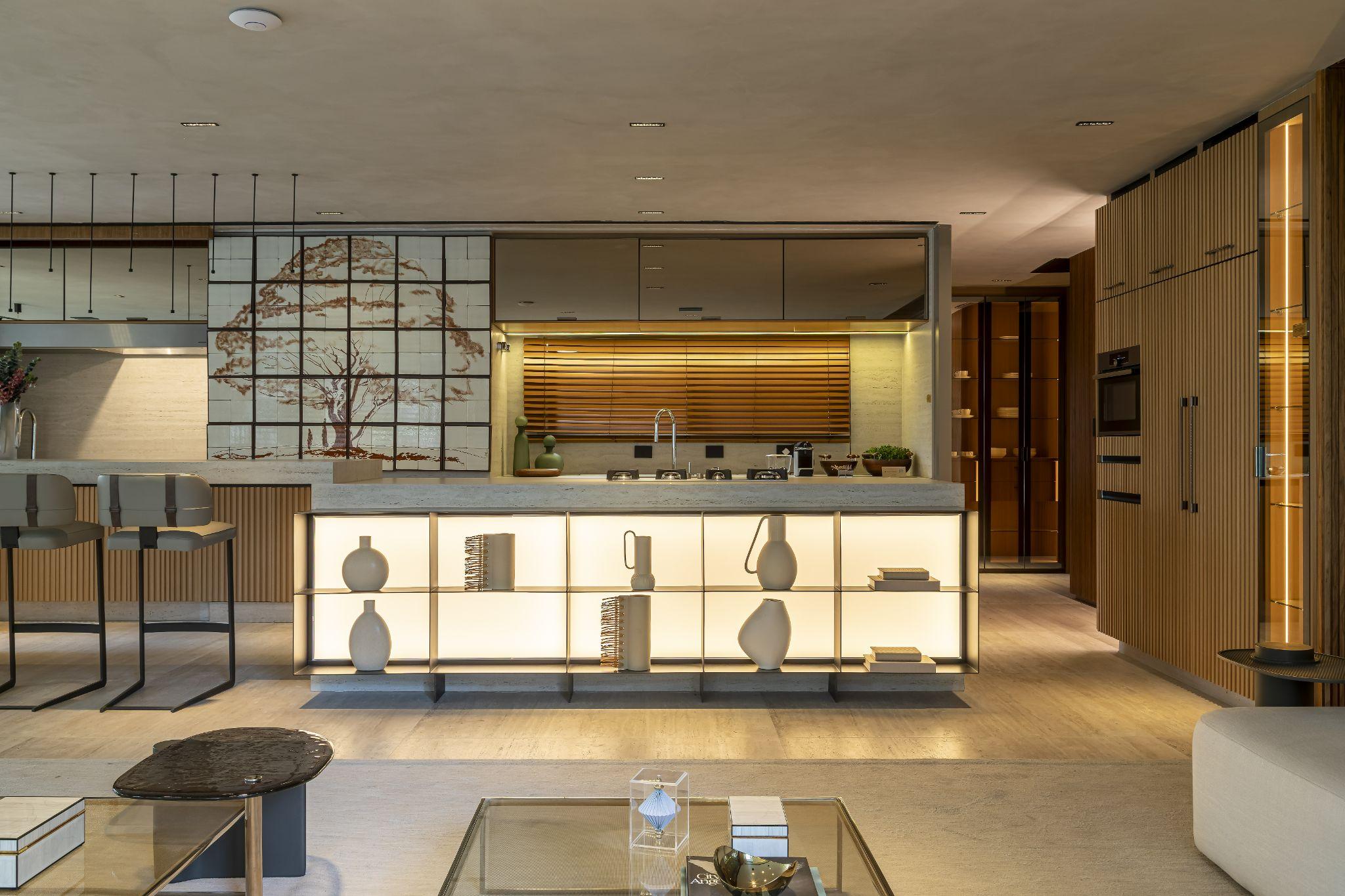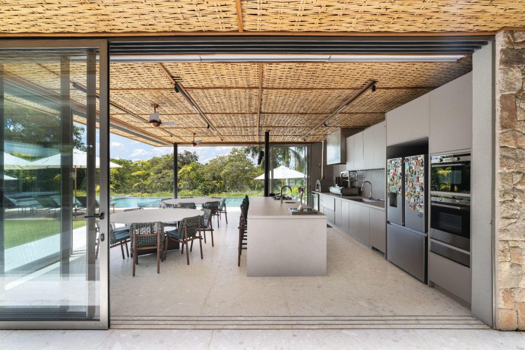 Na Glass House, projeto de Beto Borja, a linha Linear reforça o design minimalista em um ambiente aberto para a natureza. Portas de vidro deslizantes permitem que a luz natural transforme a cozinha gourmet ao longo do dia, em constante diálogo com o entorno.