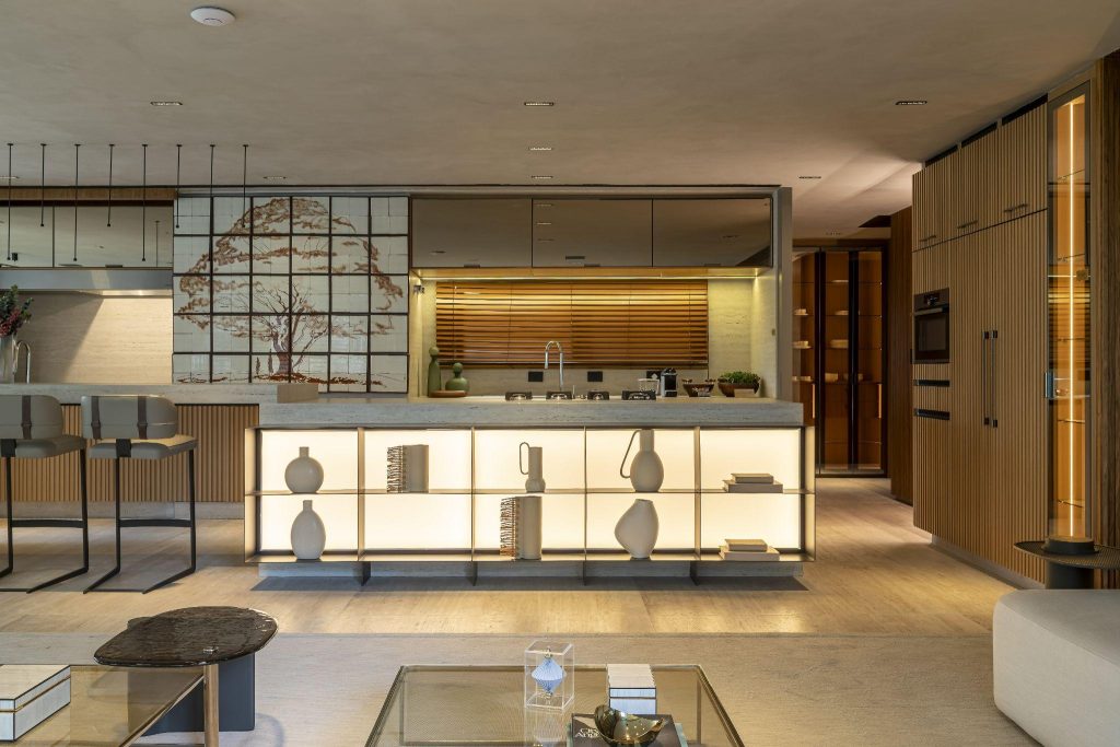 O arquiteto também criou um espaço marcado pelo contraste de materiais: madeira clara da linha Slatted e estante metálica dourada da linha Ikigai. Texturas e contrastes dão forma a um ambiente que valoriza propósito e harmonia, em sintonia com o conceito da estação.