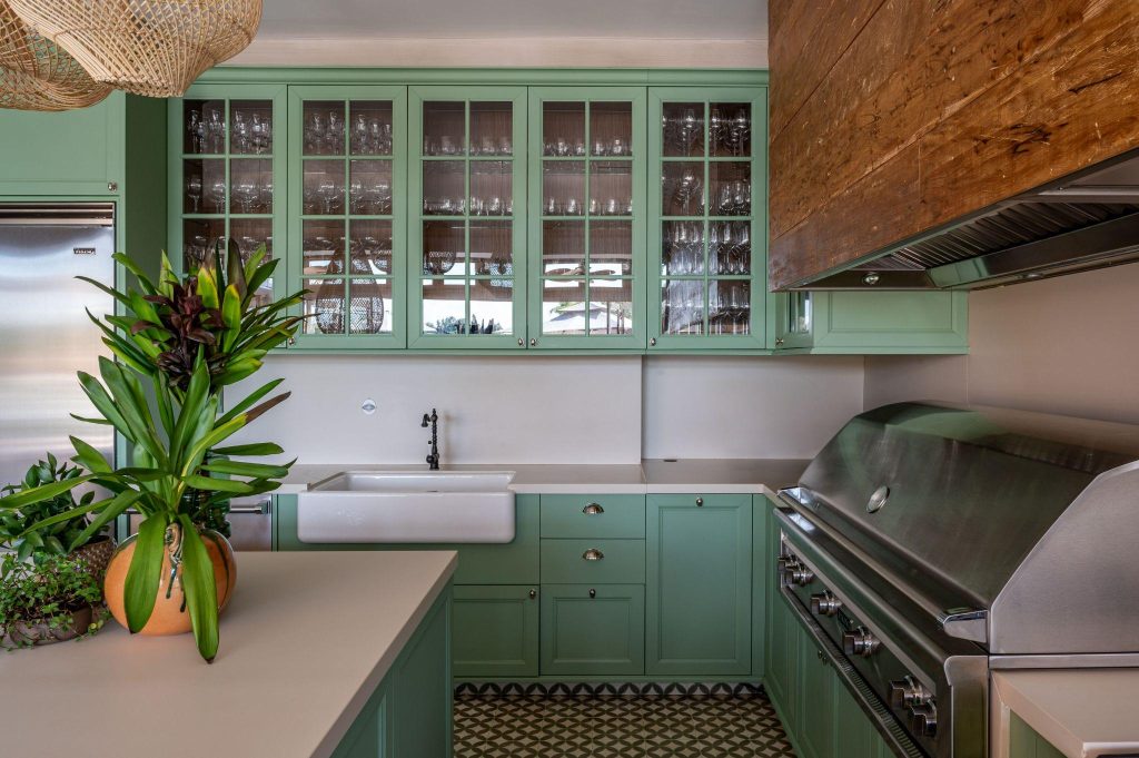 A arquiteta Deborah Roig utiliza a linha Paris, em verde oliva, pintada manualmente. As portas almofadadas prolongam a paisagem para dentro de casa, criando continuidade entre mobiliário e jardim.