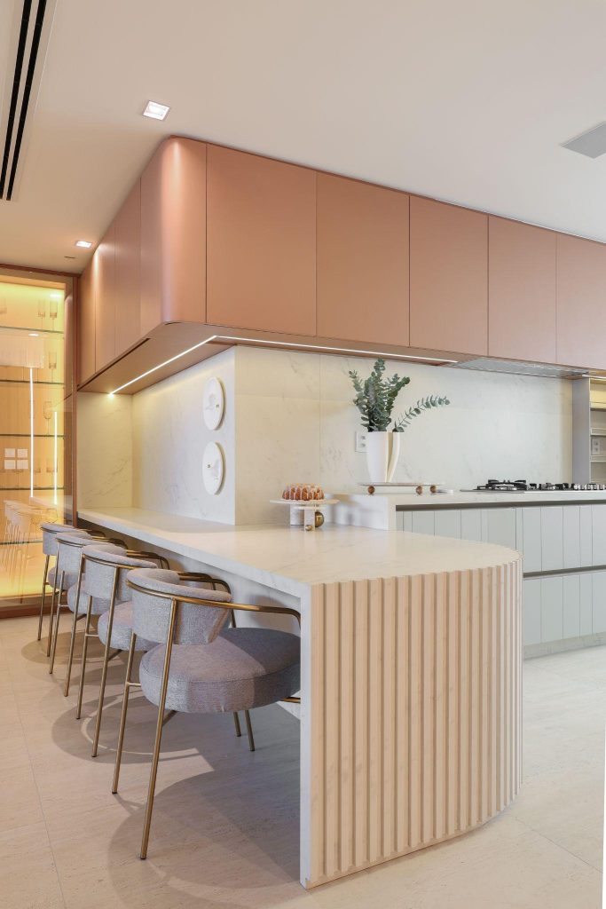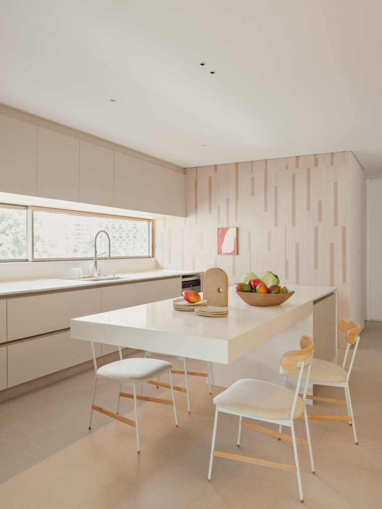 Um exemplo é o projeto de Barbara Dundes. A cozinha na linha Stripe aposta em acabamentos claros e linhas retas, criando uma atmosfera minimalista realçada pela luz natural. Ao fundo, o revestimento em rosa suave introduz movimento e reforça a delicadeza da paleta, remetendo a serenidade das primeiras flores da estação.