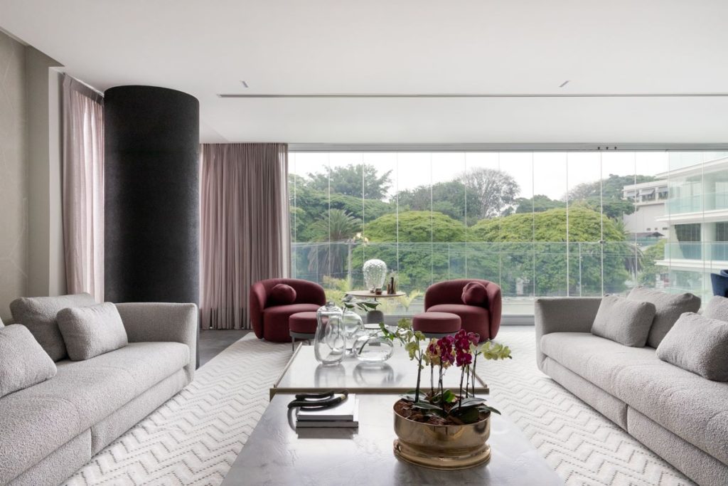 No apartamento de 230 m² projetado por Sabrina Salles, ao lado do Parque Ibirapuera, o cliente pediu um visual mais masculino. Mobiliário em tons de cinza e preto ganha equilíbrio com poltronas em tom de argila, que acrescentam sofisticação, conforto e acolhimento à sala de estar. Foto: Julia Novoa