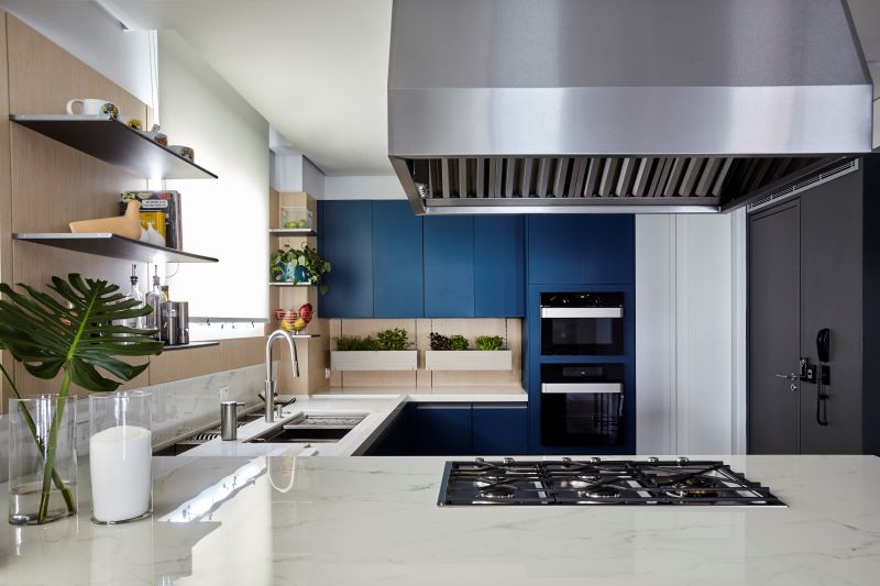 O apartamento projetado por Juliana Fabrizzi para um jovem executivo alia design, praticidade e o toque contemporâneo do azul. Para ampliar e tornar o espaço mais funcional, as paredes do antigo imóvel, antes cheio de desníveis e compartimentos, foram derrubadas. Fotos: @habitado.projeto