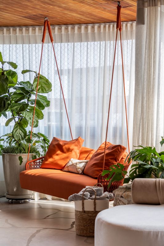 Na reforma do apartamento de 500 m² em São Paulo, a arquiteta Cilene Lupi modernizou os ambientes para atender à rotina de uma família grande, que recebe muitos parentes e amigos. O sofá em laranja traz vitalidade e intensidade à paleta neutra, tornando-se o ponto focal da área social e reforçando a atmosfera acolhedora do projeto. Foto: Rafael Renzo