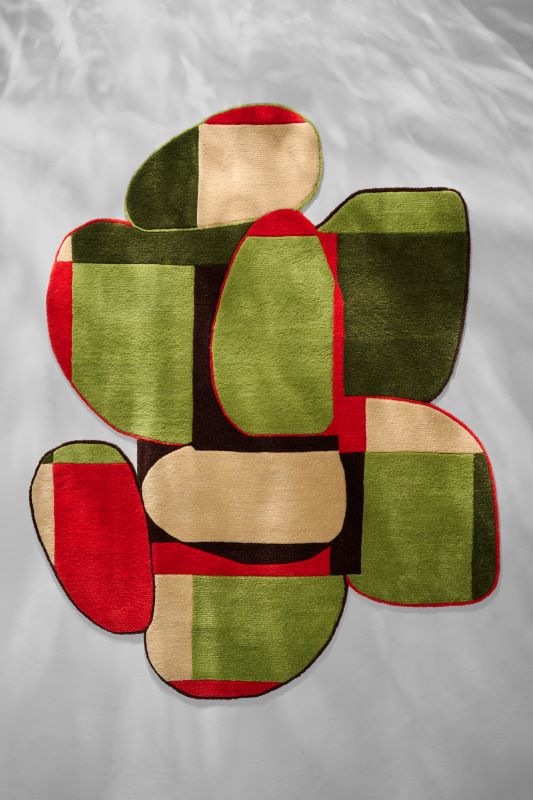 A tapeçaria Seixos, criação da arquiteta e designer Rahyja Afrange e tecida artesanalmente pela Punto e Filo, apresenta o verde junto aos movimentos orgânicos dos seixos.