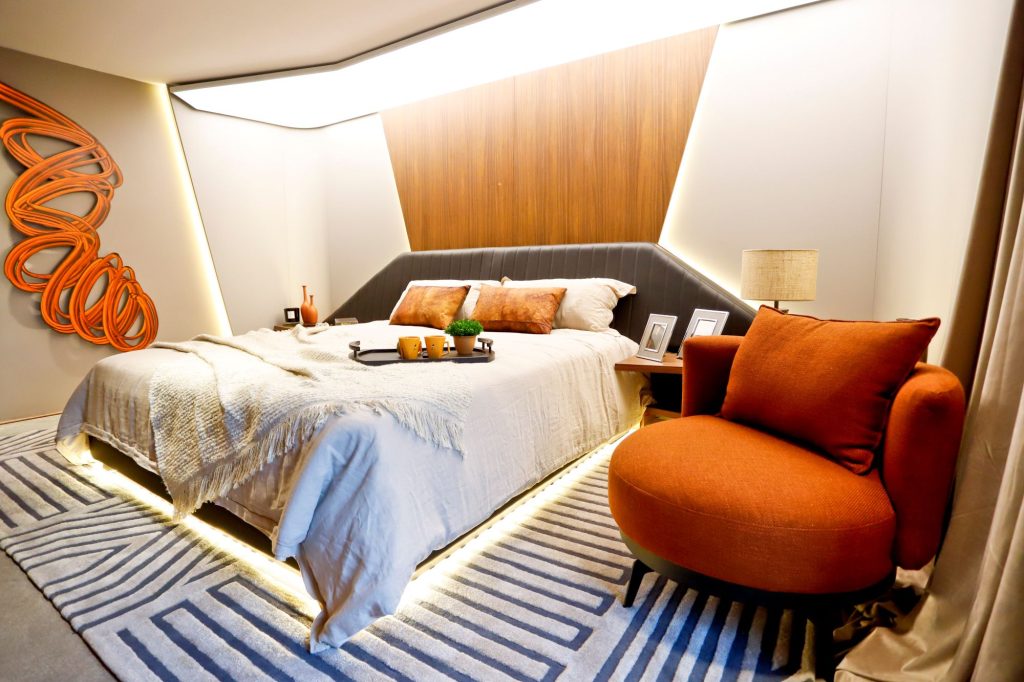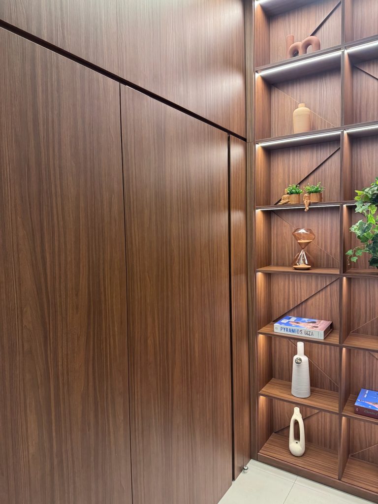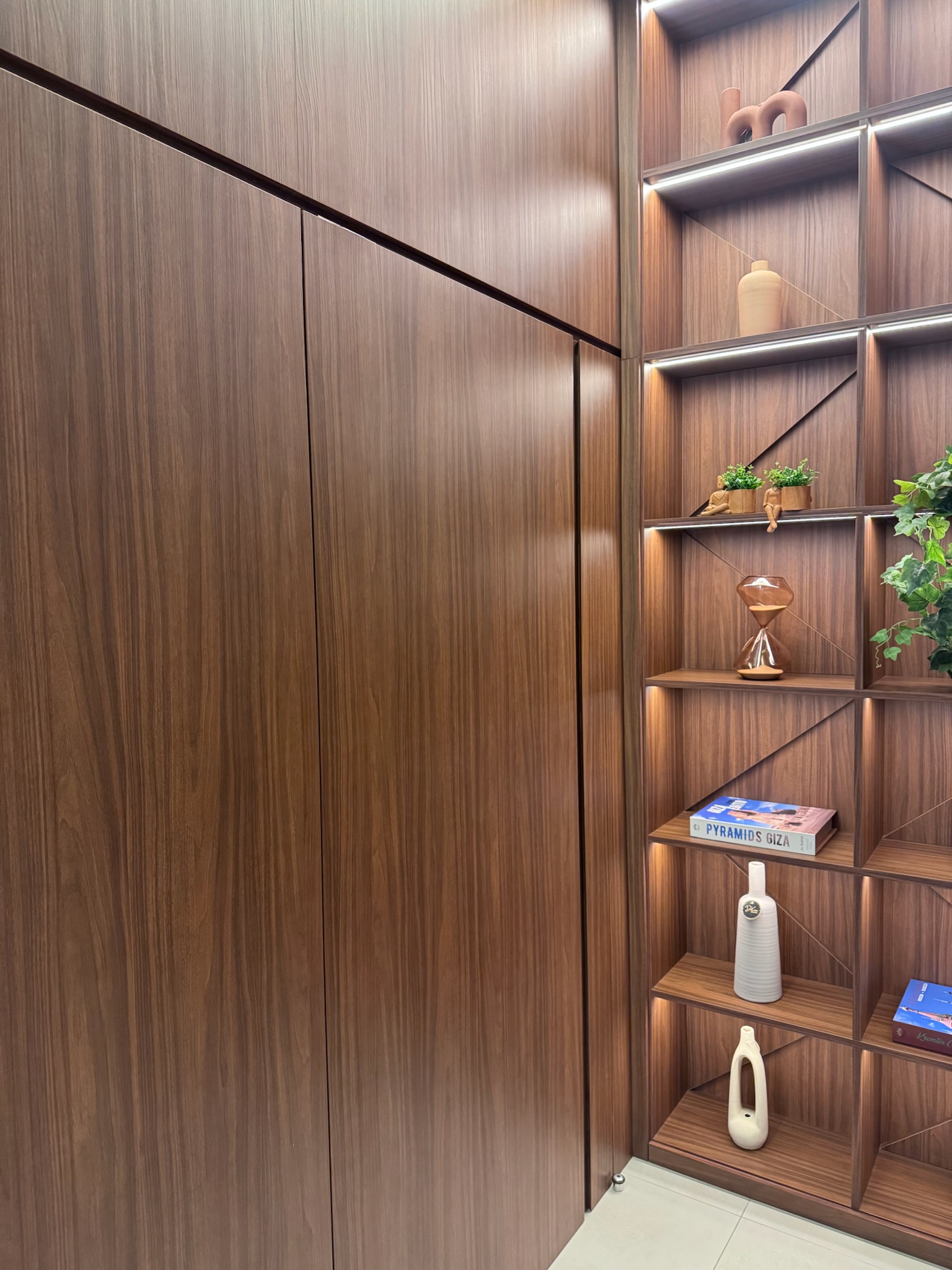 Segundo ela, a mudança é também prática. “Quando o painel organiza a parede, tudo encontra lugar: o embutido de luz, o acesso técnico, as portas ocultas. A leitura fica limpa e a sensação, mais aconchegante.”