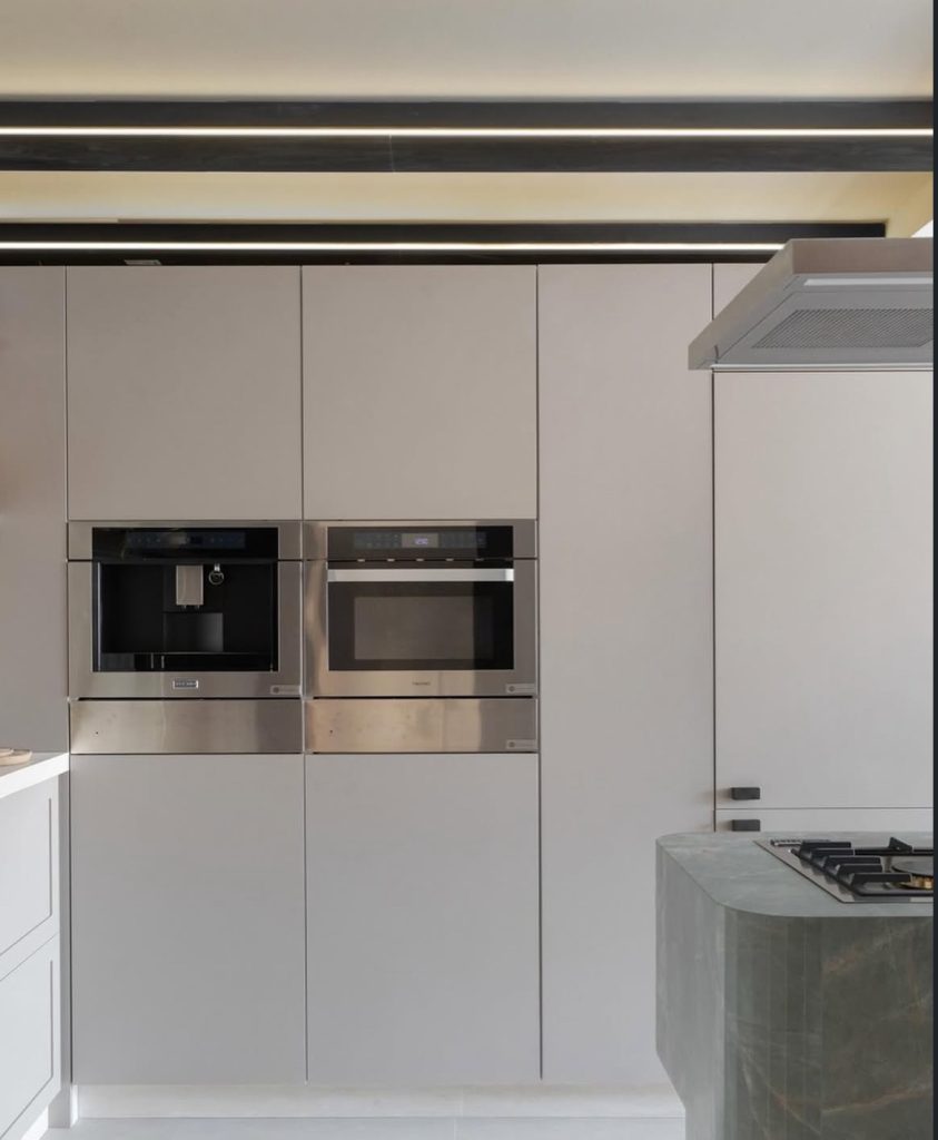 Portas camufladas em painéis de MDF, que criam um visual contínuo, elegante e minimalista. Um toque de design inteligente que une funcionalidade e estética em perfeita harmonia.
