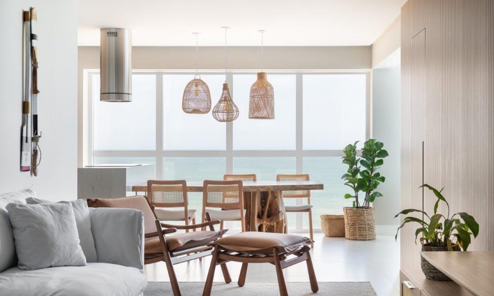 O estilo praiano contemporâneo com influências do design naturalista guia toda a proposta. Linhas limpas, base neutra e tons quentes compõem-se com elementos orgânicos para criar ambientes sofisticados sem perder a espontaneidade. Desde o início, a proposta foi apostar em uma linguagem que remetesse à natureza, integrando o interior à paisagem e priorizando materiais naturais e texturas suaves. O apartamento não passou por alterações estruturais, apenas por adequações no sistema elétrico, o que reforça a sutileza do projeto de interiores ao se adaptar com eficiência à base existente.