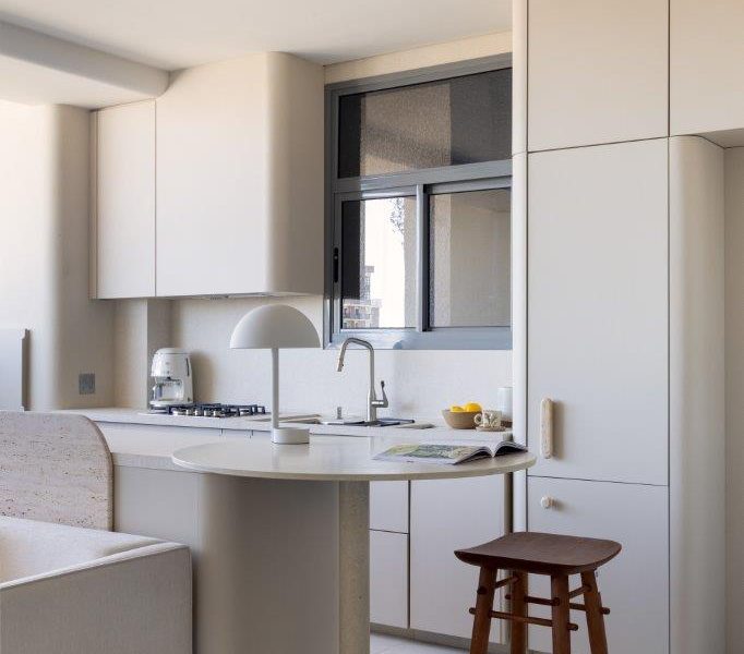 Como fio condutor, o projeto adota o mimetismo visual e a presença marcante da pedra, compondo uma atmosfera contínua, sensorial e atemporal, capaz de transformar um endereço provisório em um verdadeiro lar. A personalização foi desenvolvida após a entrega das chaves, com intervenções diretas na configuração original do imóvel. A proposta incluiu a redefinição de paredes e a subtração de um dos dormitórios para a ampliação da suíte principal, reforçando a ideia de conforto e refúgio no setor íntimo.