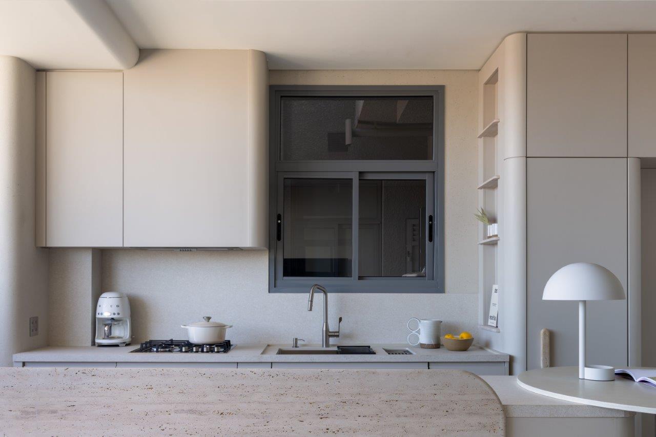 Na área social, a remoção de uma esquadria permitiu a integração do living à sacada, ampliando a percepção de espaço e a entrada de luz natural. O resultado é uma área de convivência mais fluida e conectada à paisagem urbana. Com um estilo minimalista e sensorial, o espaço busca o silêncio visual e convida ao toque, à permanência e ao desacelerar.