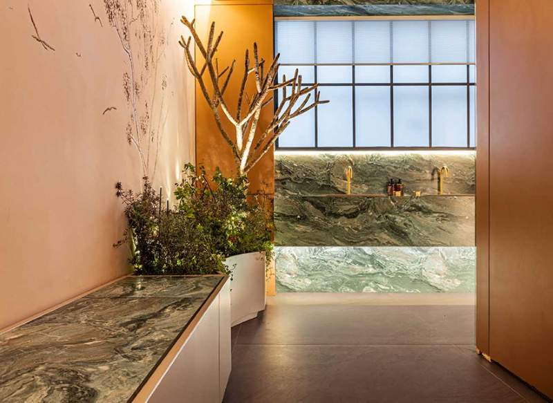 O Paladina Green, da nova Coleção Matizes, reproduz com fidelidade a aparência de uma rocha verde preciosa, com veios sinuosos e variações cromáticas de verde, criando profundidade e movimento visual. O laminado ajuda a compor uma peça fluida, elegante e funcional, que dialoga com a curvatura das paredes e abriga detalhes como objetos decorativos e até vegetação integrada.