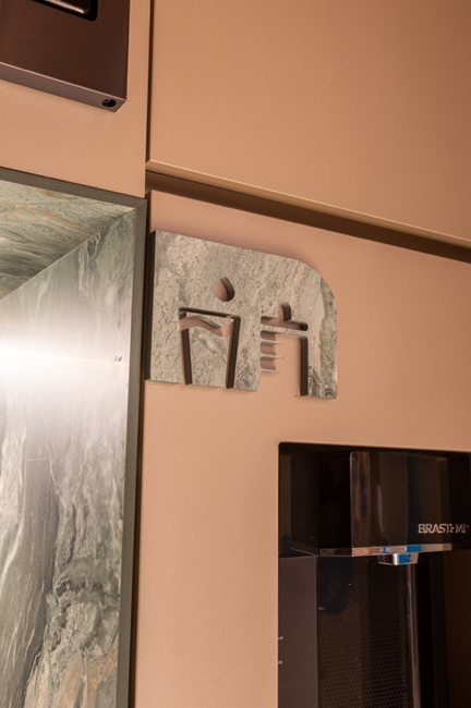 A combinação entre criatividade e funcionalidade se revela de maneira sutil, porém marcante, no uso do TS Real Color® Paladina Green 10 mm em elementos gráficos do espaço — como os identificadores nas portas e sinalizações internas.