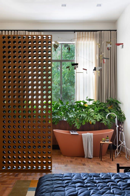 Um dos recursos mais instigantes do projeto é a divisória com elementos vazados que cria uma sutil conexão entre quarto e banheiro, sem comprometer a privacidade. O painel – também no padrão Avelã – funciona como uma passagem de luz e de diálogo entre os espaços, criando movimento, transparência e leveza. Essa abordagem traduz com elegância a ideia de fluidez entre funções distintas do lar contemporâneo, respeitando os limites sem isolá-los por completo.