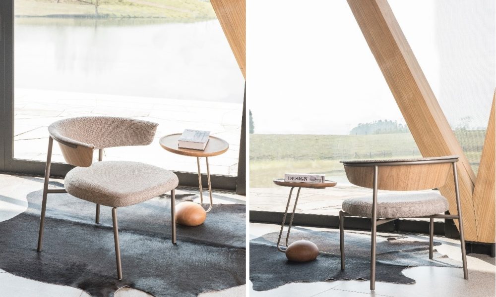 Idealizada como um gesto de reconexão com o essencial, a poltrona traduz esse encontro entre memória e design, unindo linhas suaves a materiais de marcantes, que acolhem o corpo e convidam à pausa. Ao seu lado, a banqueta reforça a mesma linguagem estética, explorando a versatilidade do mobiliário contemporâneo.