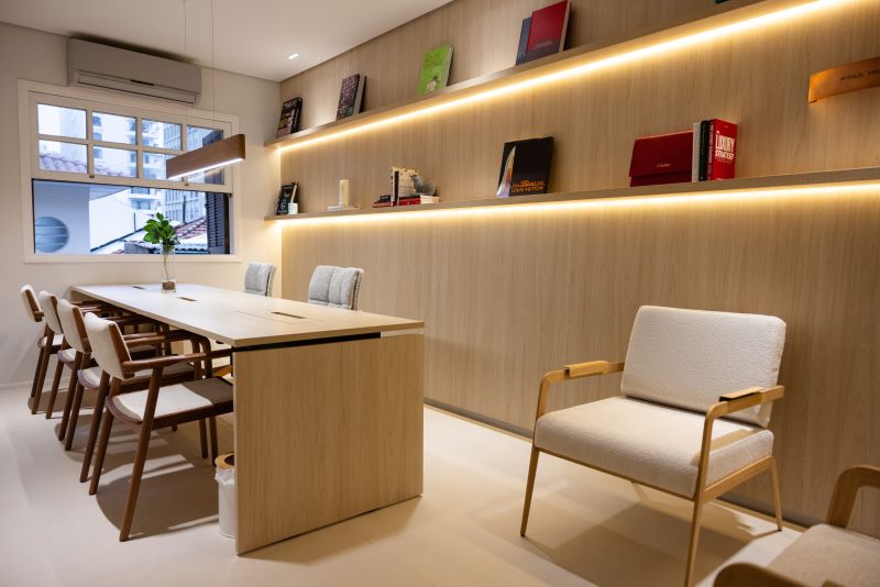 A arquiteta também comentou sobre o cuidado na montagem do mobiliário, que foi acompanhado de perto pela diretoria do Grupo. “Os detalhes executivos que recebemos antes das peças irem para corte tinham qualidade excelente, o que nos deixou muito entusiasmados. Durante o processo de montagem, acompanhamos de perto e vimos a dedicação e a organização da equipe. Ficamos positivamente surpresos com o nível de profissionalismo em todas as etapas que a OFFICINA entregou”, completou Amanda.