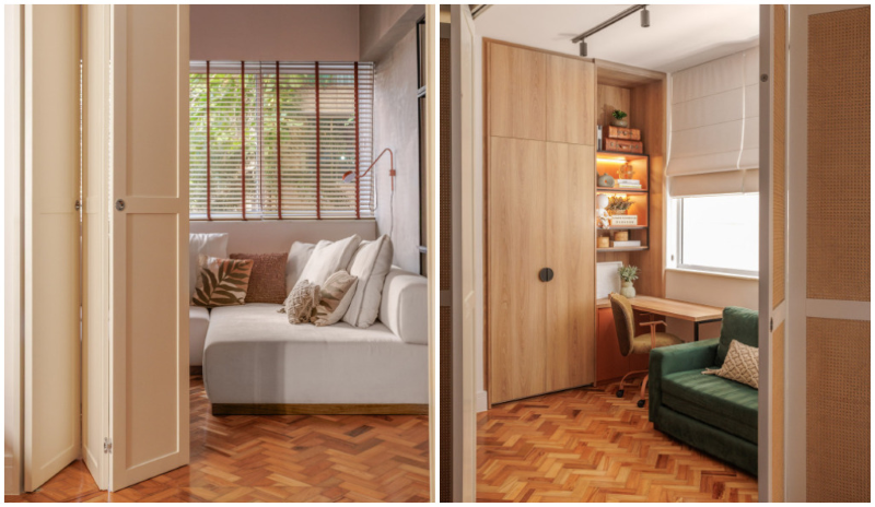 A planta foi completamente reorganizada: um dos antigos quartos deu lugar à nova sala de TV, integrada à área social e à cozinha. Já o segundo dormitório foi transformado em ambiente reversível, separado da sala por uma porta camarão em L que, quando aberta, amplia o espaço.