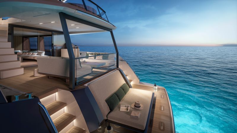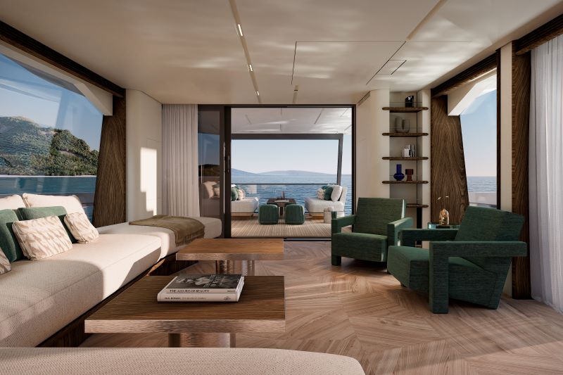 O salão principal, considerado o coração do barco, une cozinha, sala de estar e jantar em um layout fluido com móveis soltos e integração ao terraço de popa, o Infinity Terrace, que cria uma experiência de vida a bordo próxima à arquitetura residencial de luxo contemporânea. “Este é um dos elementos mais emblemáticos da estética criada por Mancini, um terraço de popa com guarda-corpos de vidro que amplia a conexão com o mar”, explica Caputo.