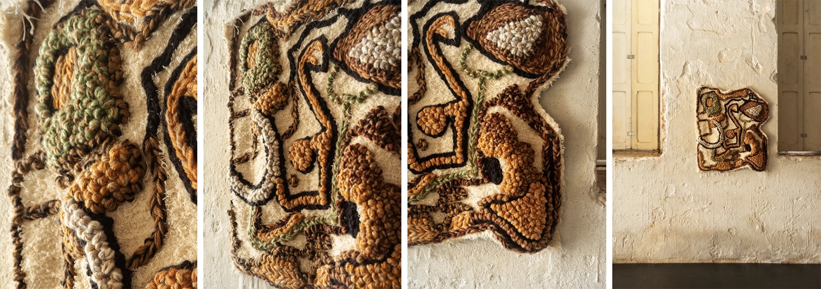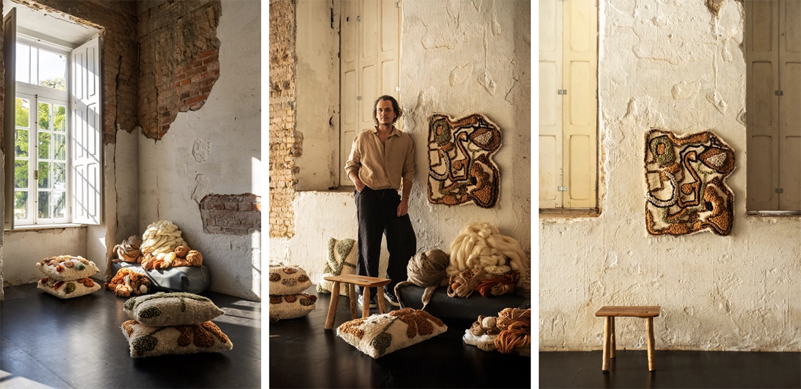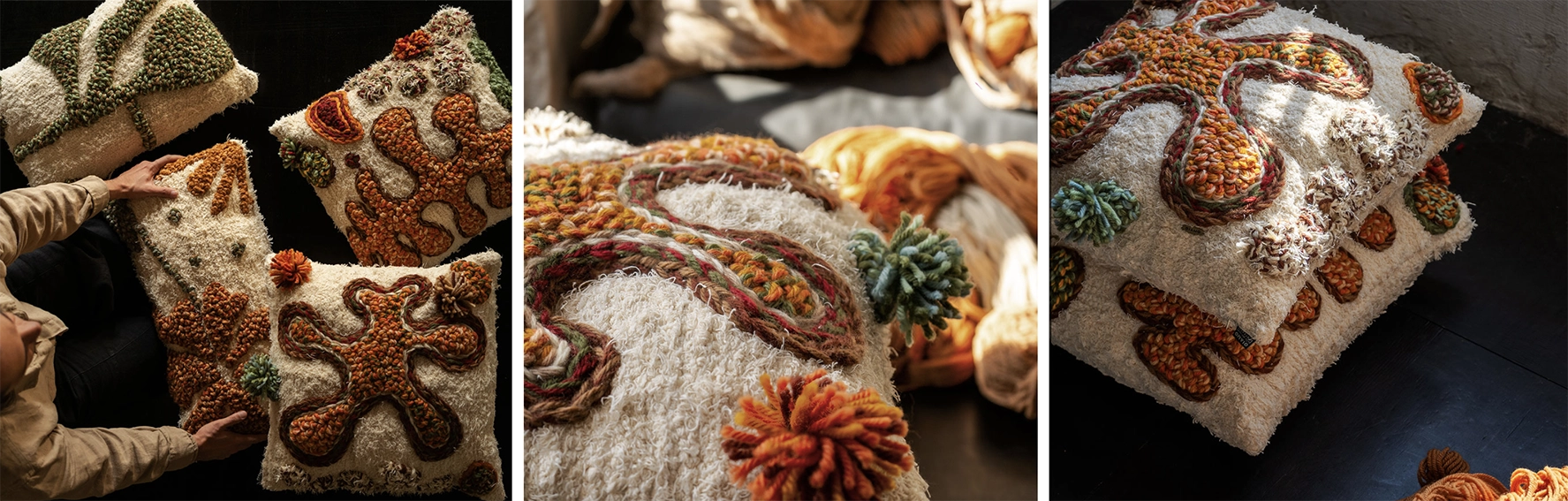 Produzida em algodão reciclado e lã natural, a série traduz a linguagem autoral de Tiago Braga, expressa em paisagens têxteis representadas em tapeçarias e almofadas. Os relevos orgânicos e bordados livres exploram combinações cromáticas inesperadas e texturas que evocam colinas, arroios, campinas e charcos. Para o artista “Cada ponto é como o passo firme de um cavalo pampa sobre o solo aberto; cada cor, um sopro do vento minuano.”