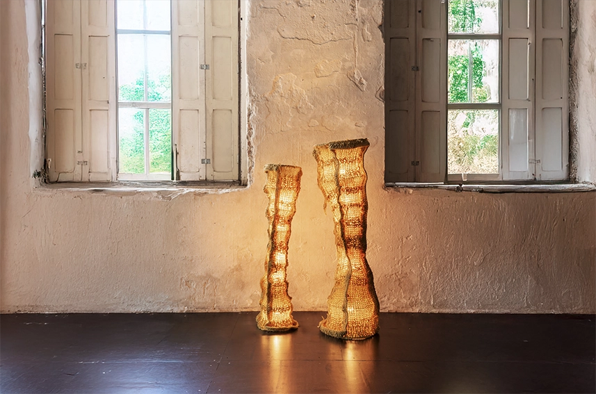 Com estruturas orgânicas, que remetem às formas presentes na paisagem do extremo sul brasileiro, os artefatos luminosos são recobertos pelo trabalho minucioso do tricô e do crochê, técnicas quase extintas que concentram a atenção plena e o cuidado de quem os tece. Em contraste com o ritmo acelerado do mundo, convidam ao toque e à pausa contemplativa.