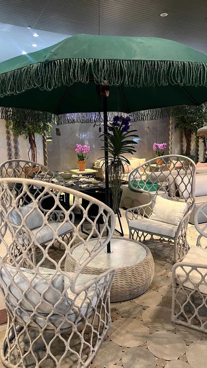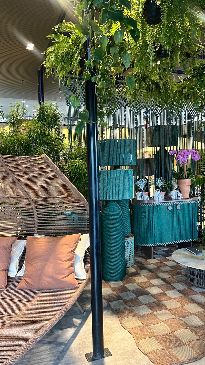 Inspirado pela bioeconomia amazônica e por processos circulares, o espaço apresenta a linha Amazônia da Tidelli, com peças produzidas à mão por artesãos em madeira, alumínio, vidro, tecidos de alta durabilidade e corda náutica fabricada pela própria marca. O reaproveitamento de resíduos industriais em novos acessórios e combustível reforça o compromisso de ambas as empresas com práticas de baixo impacto ambiental.