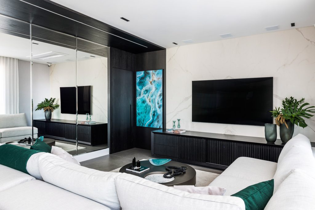 Com base na paleta clássica de preto, branco e cinza, e toques pontuais de azul-marinho, o projeto transmite uma sofisticação atemporal. Logo na entrada, o pórtico preto com espelho do piso ao teto, ladeado por obras de arte selecionadas, cria uma cena de impacto que surpreende e encanta qualquer visitante.