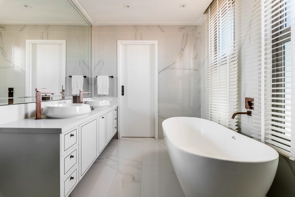 O banheiro do casal, adaptado para oferecer conforto e praticidade, conta com duas pias, paredes e piso revestidos em mármore Calacata e uma banheira de imersão que compõe um cenário digno de sonho. Todo o apartamento, situado nas alturas e adornado com peças de arte moderna, foi pensado para receber com estilo, acomodando um grande número de visitas e refletindo o estilo de vida e a história dos moradores.