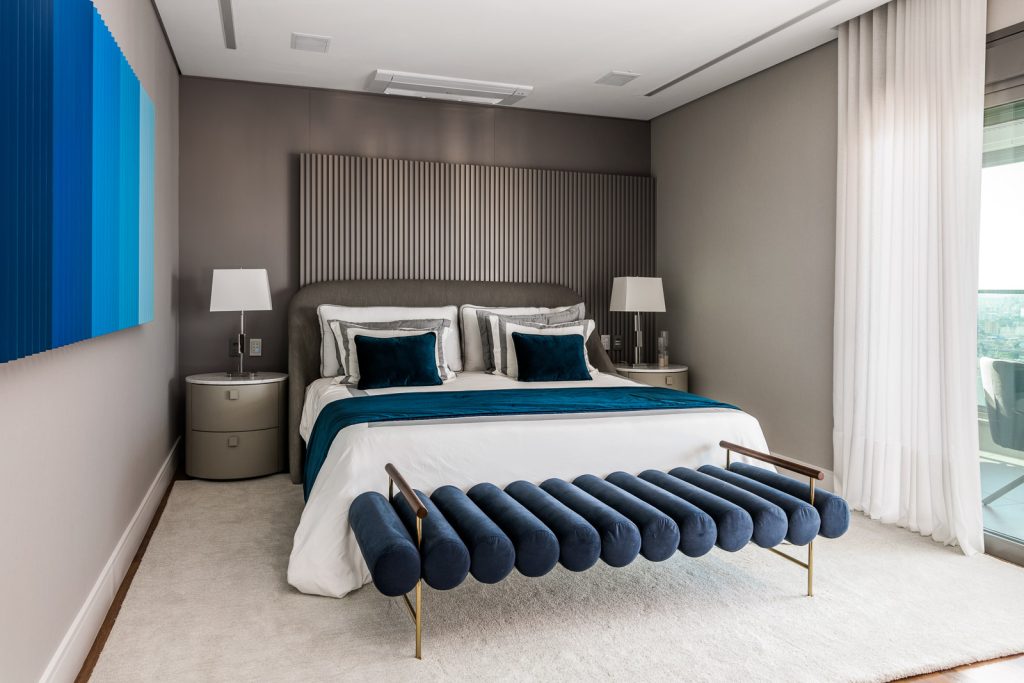 O quarto de casal aposta em uma paleta de cinza com toques de azul-marinho, que funcionam como pontos de cor e acrescentam personalidade. O resultado é uma atmosfera contemporânea, elegante e acolhedora. A tela abstrata do artista Solferini, em diferentes nuances de azul, complementa a composição e reforça a harmonia do espaço.