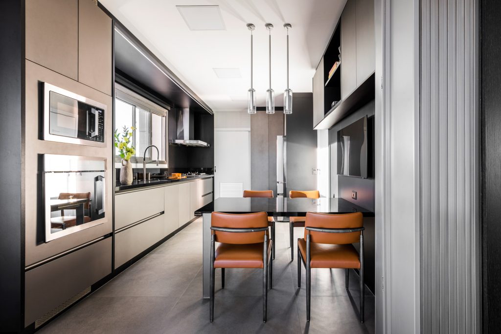 A cozinha segue uma proposta minimalista e moderna, equipada com soluções práticas e sofisticadas que se adaptam à rotina da família, como coifa e cooktop. A combinação de preto com tom fendi reforça a linguagem elegante presente em todo o apartamento, enquanto as cadeiras em tom caramelo aquecem a paleta sóbria, trazendo equilíbrio e acolhimento ao ambiente.